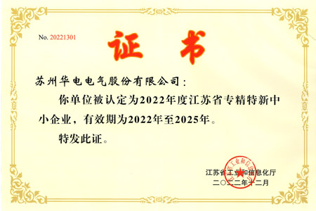 苏州华电被认定为2022年度江苏省专精特新中小企业