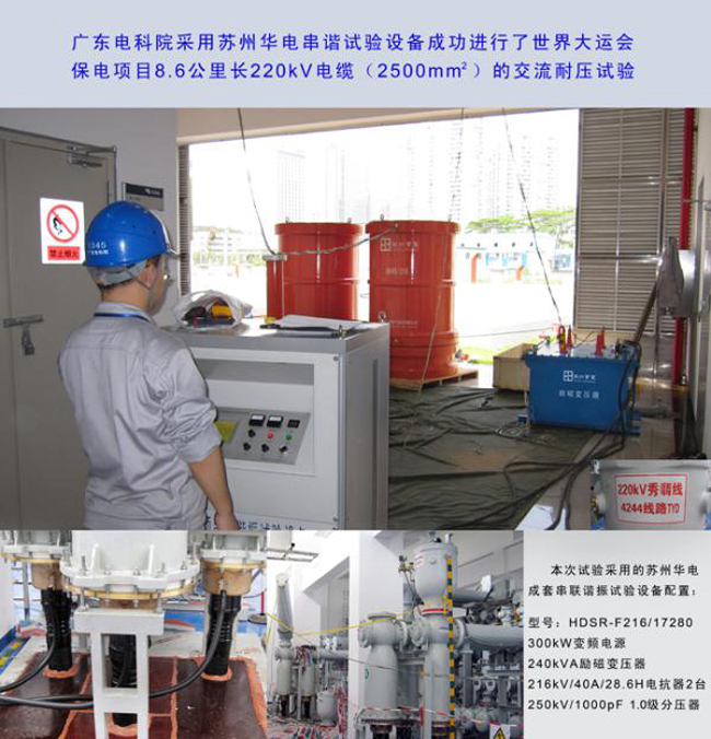 广东电科院采用苏州华电串谐试设备成功进行了世界大运会保电项目8.6公里长220kV电缆(2500mm2)的交流耐压试验